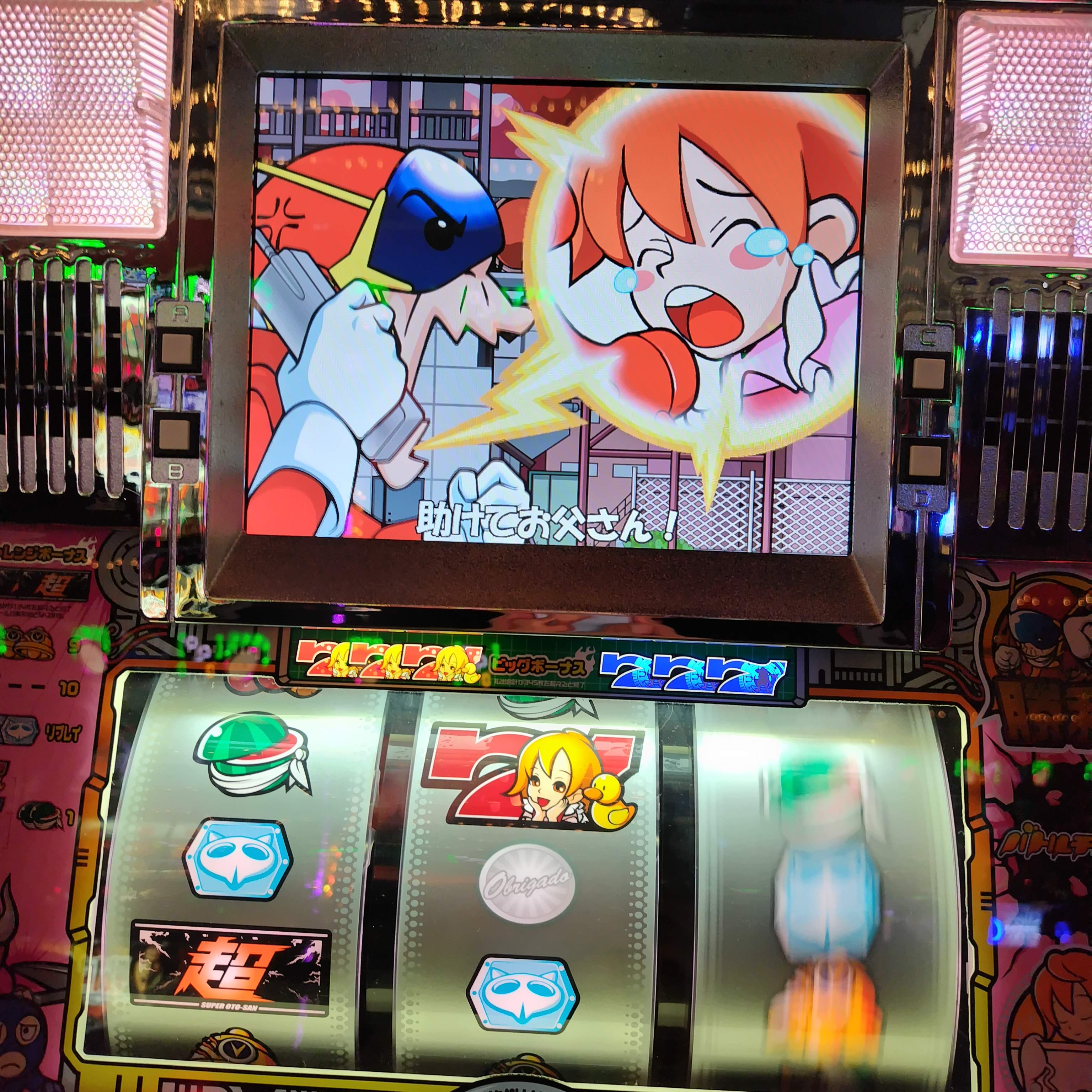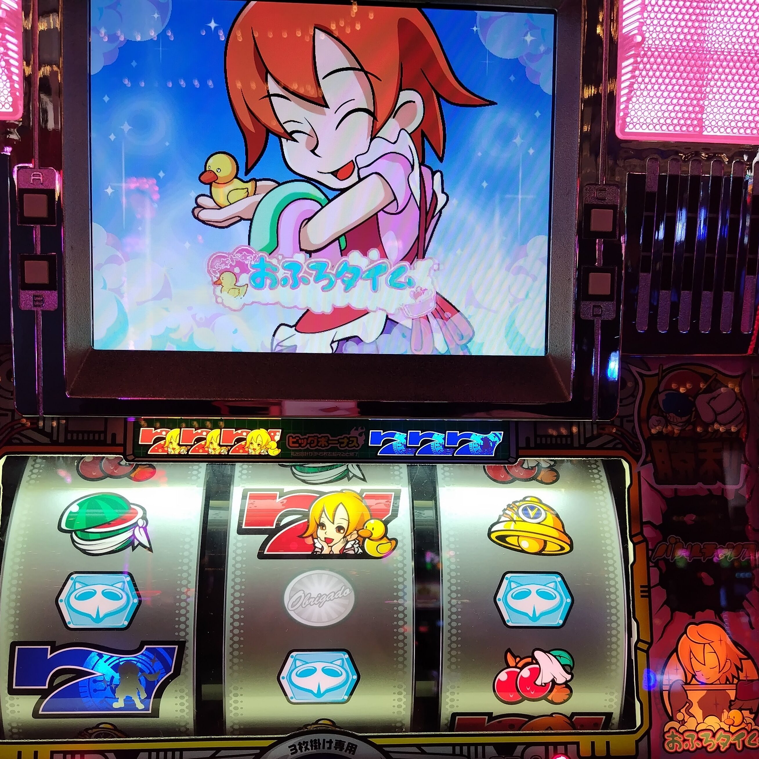 ほかにも打ちたい台はあるし適当なところでやめよう、と思っていたところへ、オッサンとなった今では凝視するのはちょっと恥ずかしい「おふろタイム」(数ゲーム間続くボーナス煽り演出。ルリちゃんがタケオに覗かれずに無事おふろに入れば成功、だったっけ? 失敗時もタケオは奥さんのサチコにどつかれて結局覗けない)が発生、それがスカったところでヤメました!
