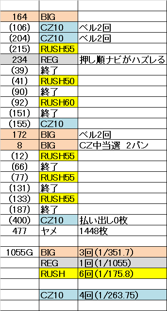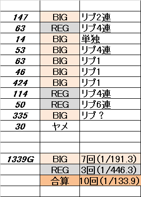どうせ単発、と思いながら消化していきますと、AT中の押し順に従って押したらいきなりなにも揃わずBGM停止、という私の好きな入りパターンが炸裂してREGを引きました。リアルボーナス搭載の昔のAT機はこれがいいんだなあ。