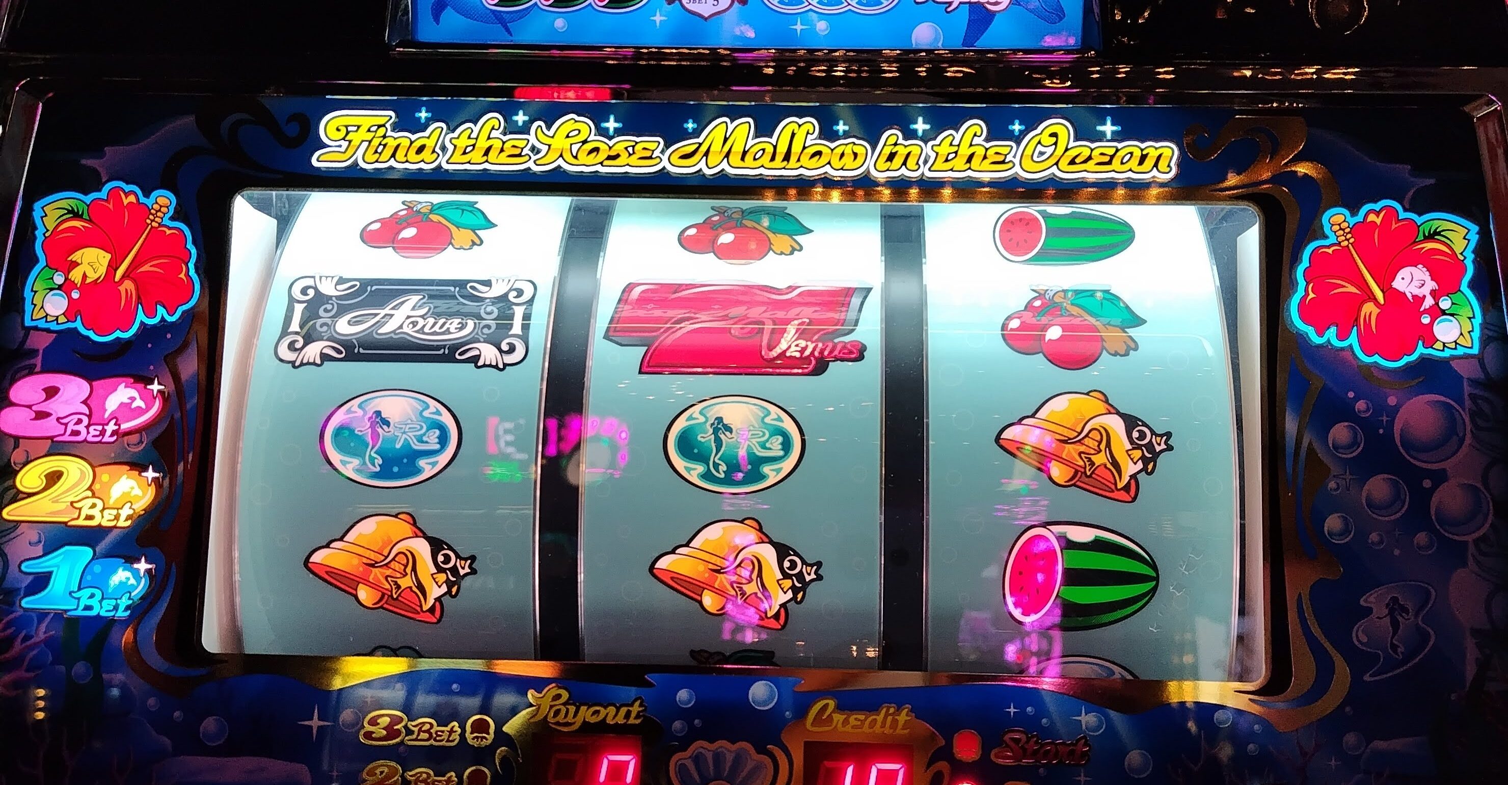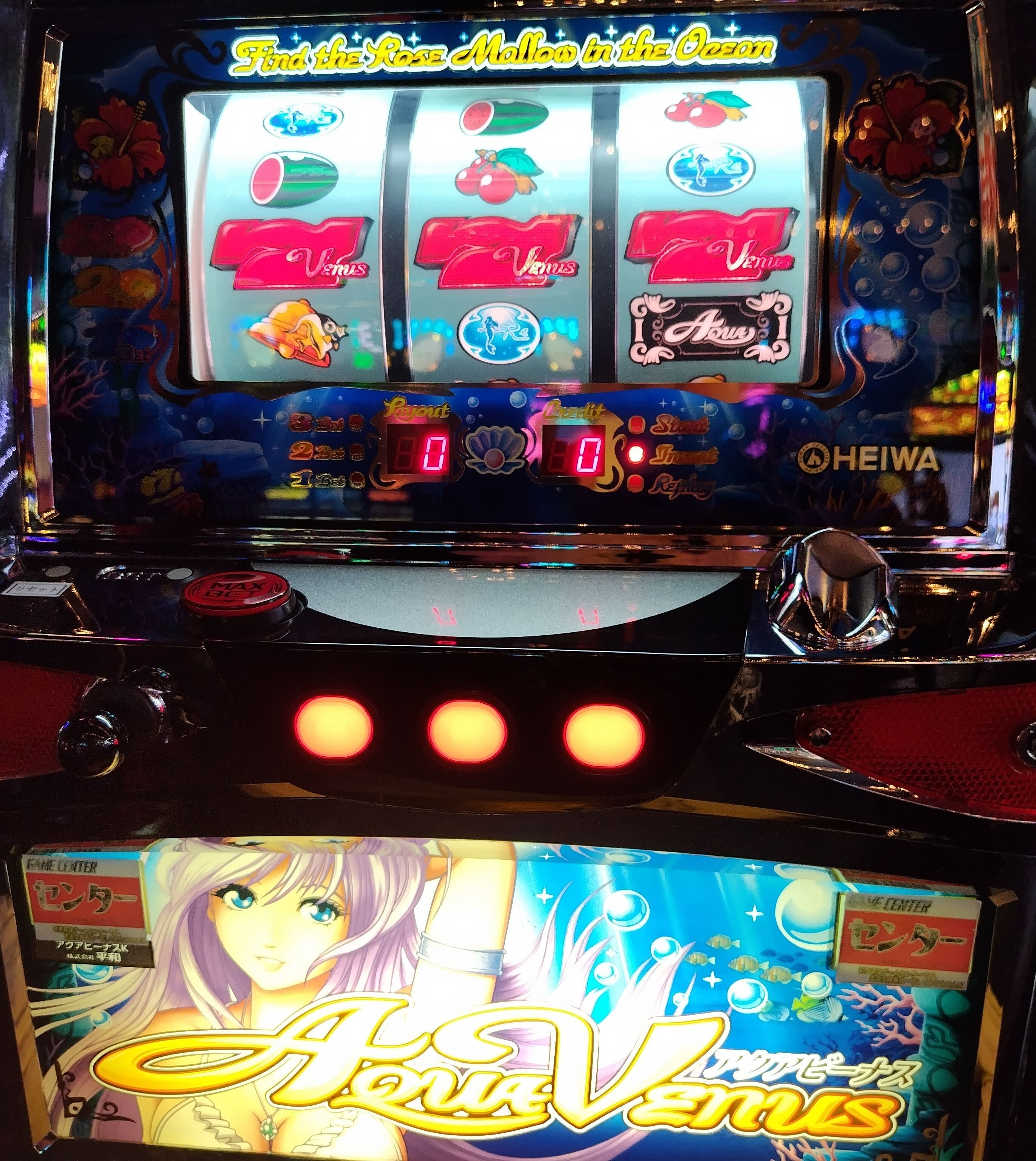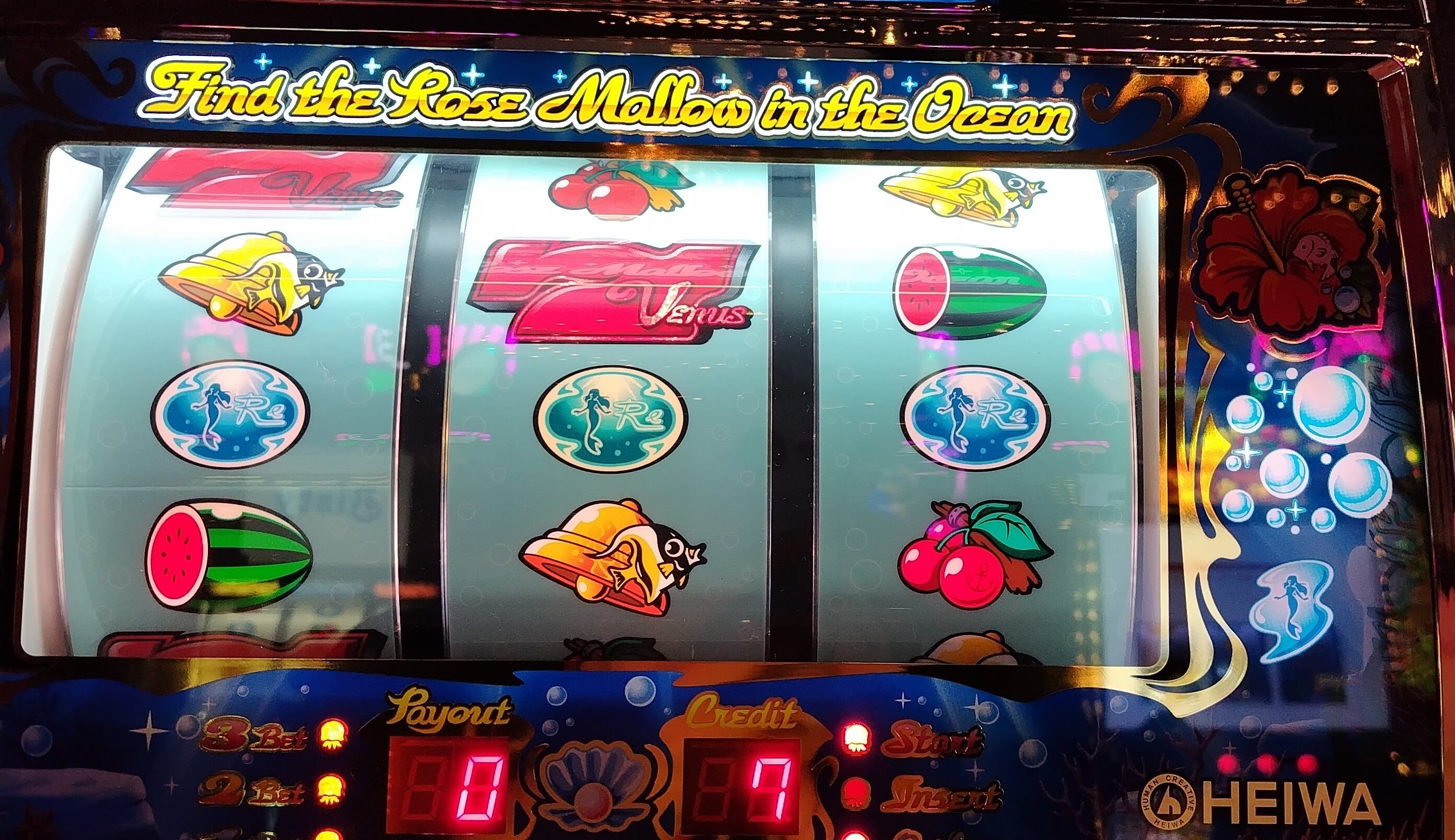 平和系の伝統を受け継いだ7図柄も最重要小役であるリプレイの図柄もカッコイイし、下パネルの女の子もカワイイ。そしてハイビスカスが点灯すればボーナスという告知系マシンとあって、私にとってはそそられる要素しかない台でした。
