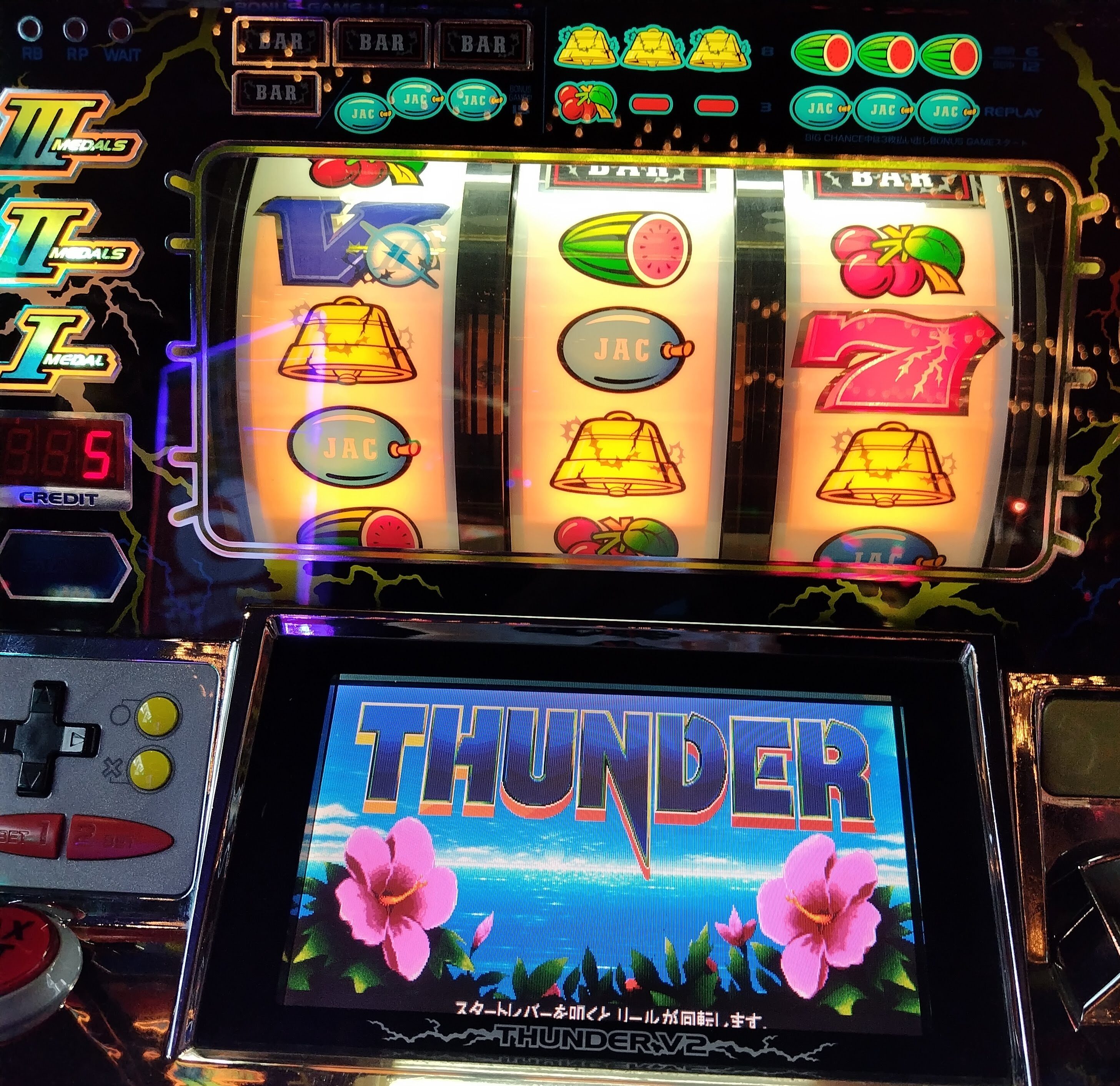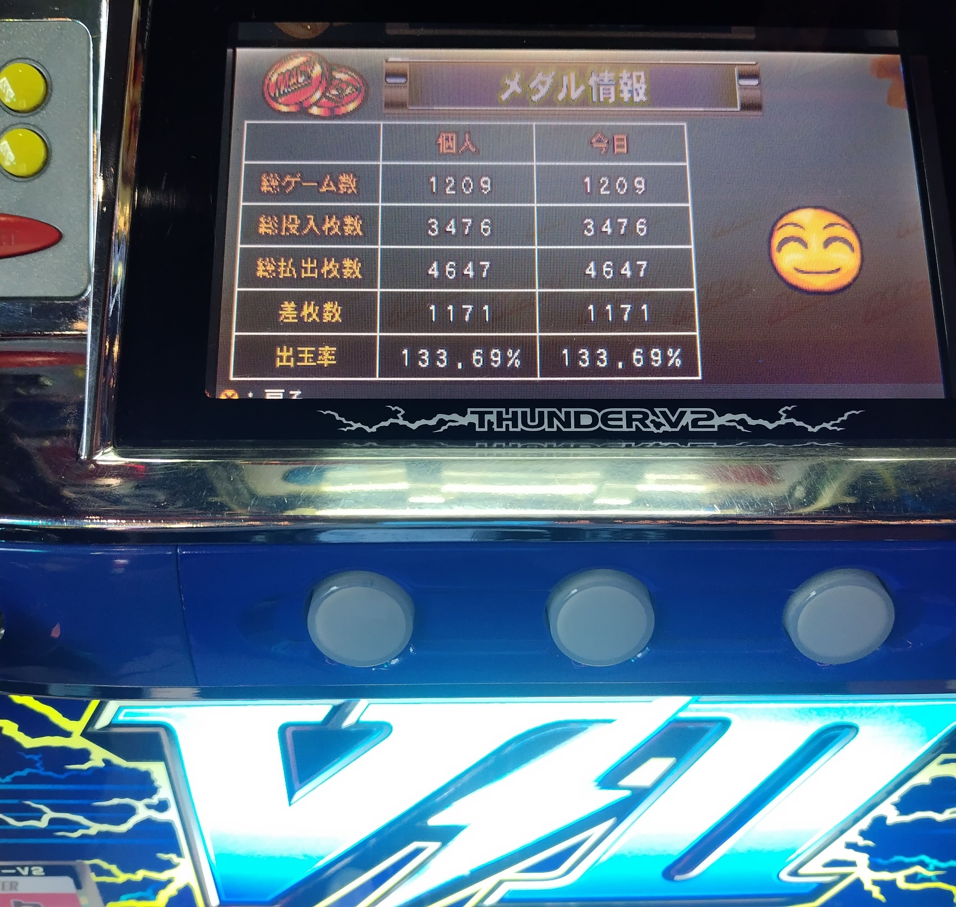 隣の「リアルボルテージ2」はこっちよりさらにバカバカしいほどのすさまじい出玉になってました! 「サンダーV2」は要所で小役を取りこぼすと大損する(チャンスゾーン中は小役をこぼすと払い出しが受けられない)し、「リアルボルテージ2」もBIG中の毎ゲームの目押しができないとお話にならない厳しい台でしたが、その意味で現在のマシンの「スマホみながらテキトースライド打ちでOK」の台とは要求される集中力が大違い。 パチスロの「遊技」性の圧倒的な低下っぷりにガクゼンとする。ひたすら集中力が必要とされるような打ち手を選ぶ台ばかりでは困るけれど、そういう台が絶滅してしまってはもうパチスロは終わりでしょう。